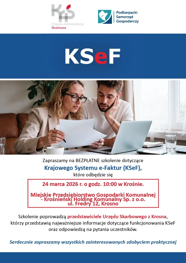 W Krośnie zaplanowano praktyczne spotkanie poświęcone fakturom elektronicznym – szkolenie odbędzie się 24 marca o godz. 10:00 w siedzibie Miejskiego Przedsiębiorstwa Gospodarki Komunalnej w Krośnie. Organizatorzy stawiają na konkret i dialog: prowadzą je eksperci z Urzędu Skarbowego w Krośnie, którzy mają wyjaśnić zasady działania systemu i odpowiedzieć na pytania. Udział jest bezpłatny, a zapisy prowadzone są drogą elektroniczną; szczegóły znajdują się na plakacie wydarzenia.